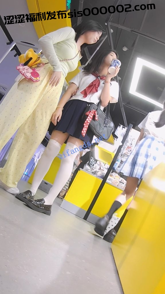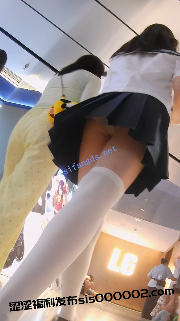 •  标准水手服的学生妹和闺蜜一起逛街,半腿白丝在大腿上勒出性感的勒痕,裙摆随走路飘动,露出嵌入屁股里的白内。
